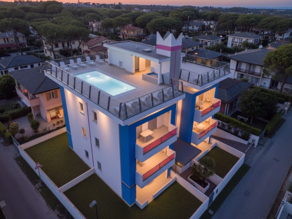 Il Residence VILLA REGINA è una moderna struttura situata in zona Lido dei Pini, vicino alla passeggiata dei negozi, a circa 250 metri dalla spiaggia (10 min. a piedi). Dispone di appartamenti bilocali per 4/5 persone, completamente arredati e composti da soggiorno con angolo cottura, camera da letto, bagno, giardino recintato per gli appartamenti al pian terreno, loggia esterna per quelli ai piani superiori. Piscina attico con zona bambini e idromassaggio, solarium con lettini, parcheggio privato per ciascuna unità abitativa, ascensore.